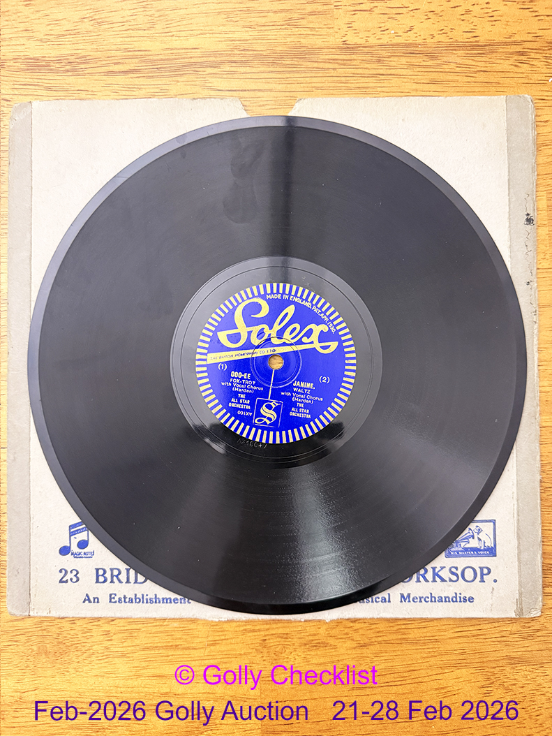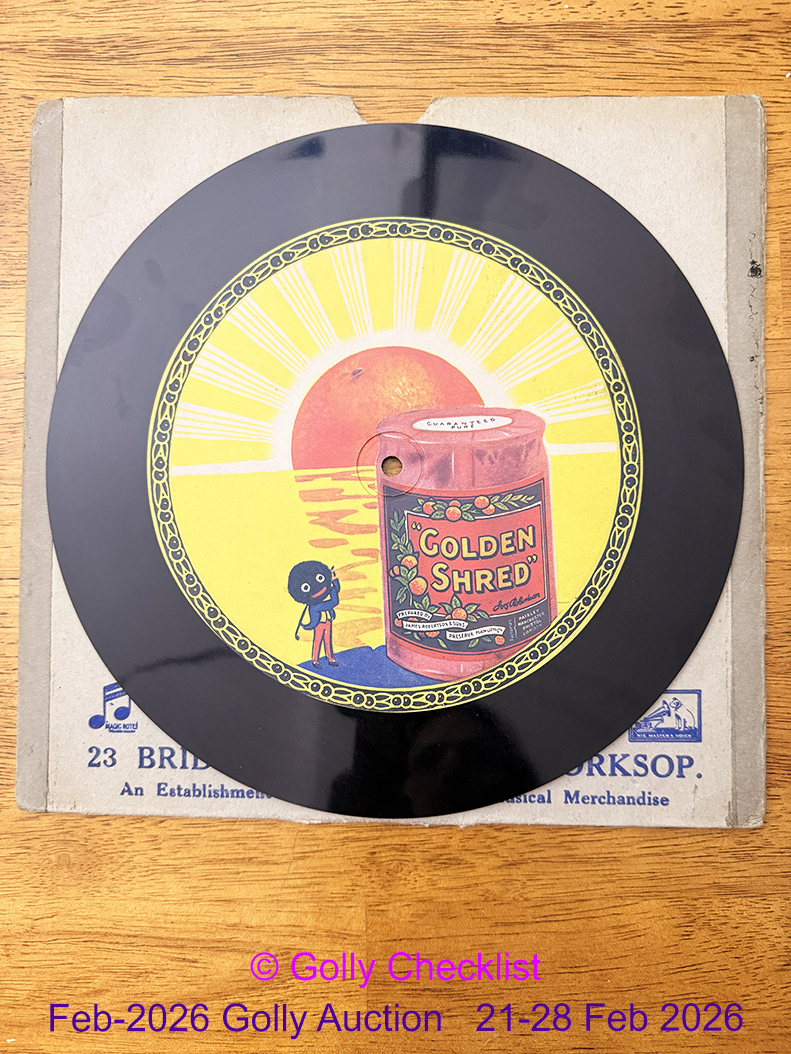 DESCRIPTION: Offered for sale is a genuine original Vinyl Record from the 1930's. Produced by the British Homophone Company with a beautiful Golden Shred advert showing an early Golfer in front of a large Golden Shred jar with a dreamy sundrenched orange sea. This is an unusual and genuine original item listed as Q14 in the Golly Guide.