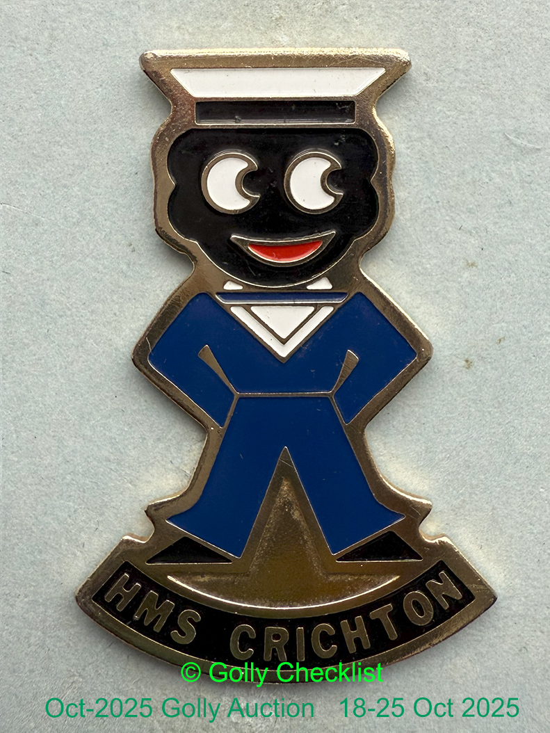 DESCRIPTION: A rare opportunity to add one of most desirable badges from the 1980's to your collection. The genuine HMS CRICHTON. Issued to commemorate the Robertsons Golly becoming the official mascot for this naval minesweeper in 1983. The connection remained until the ship was decommissioned in Rosyth in 1985. It is known that at least two batches of this badge were produced, the differences between them being the shade of blue used. One being subtly but distinctly darker than the other. The dark shade is much more difficult to find.