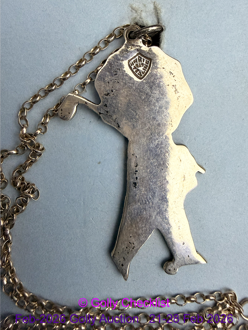 DESCRIPTION: Offered for sale is a rare 1980's Silver Pendant GOLFER. Complete with chain although not believed to be original. Issued for only a short time during the late 1970's/early 1980's. Considered by many collectors to be some of the most beautiful of the Golly items issued by Robertsons, the way the silver detailing has been carefully crafted to show through the transparent enamel is clearly the work of a master craftsman.