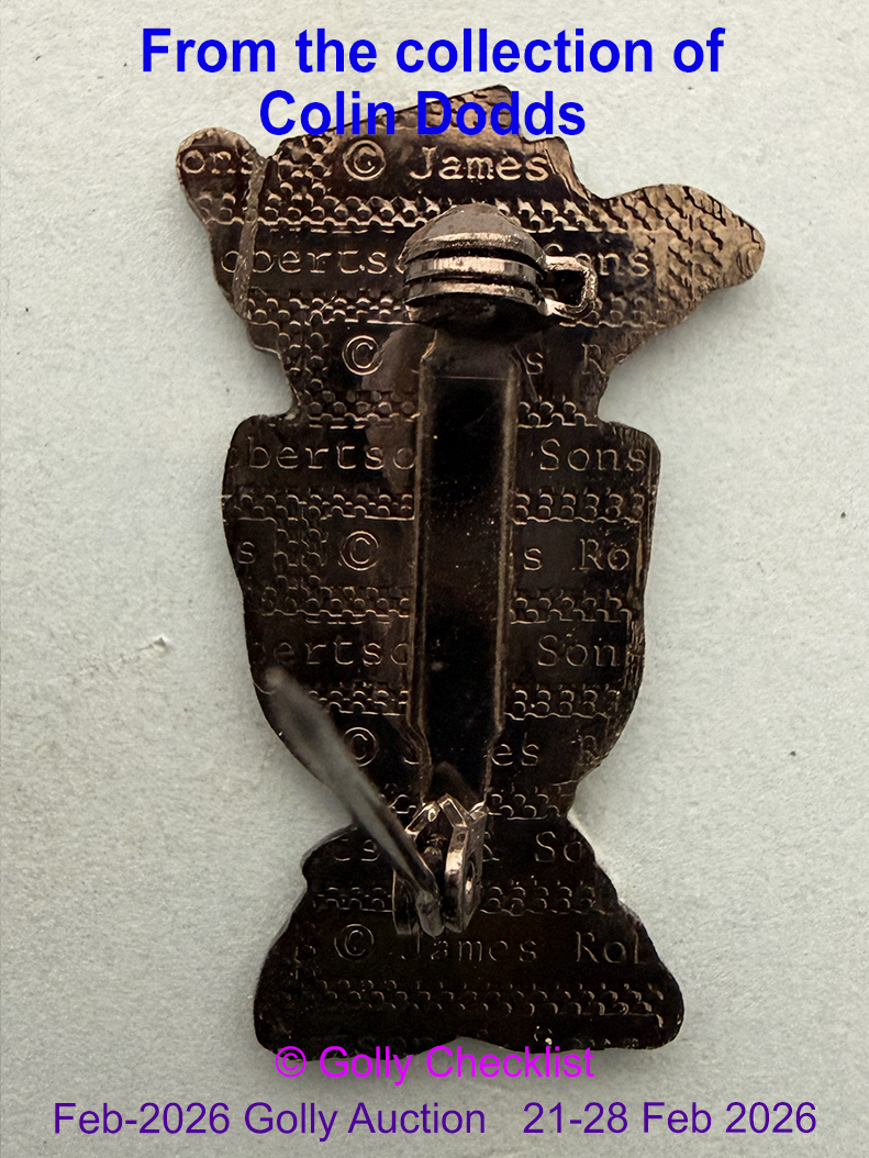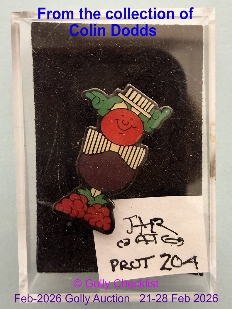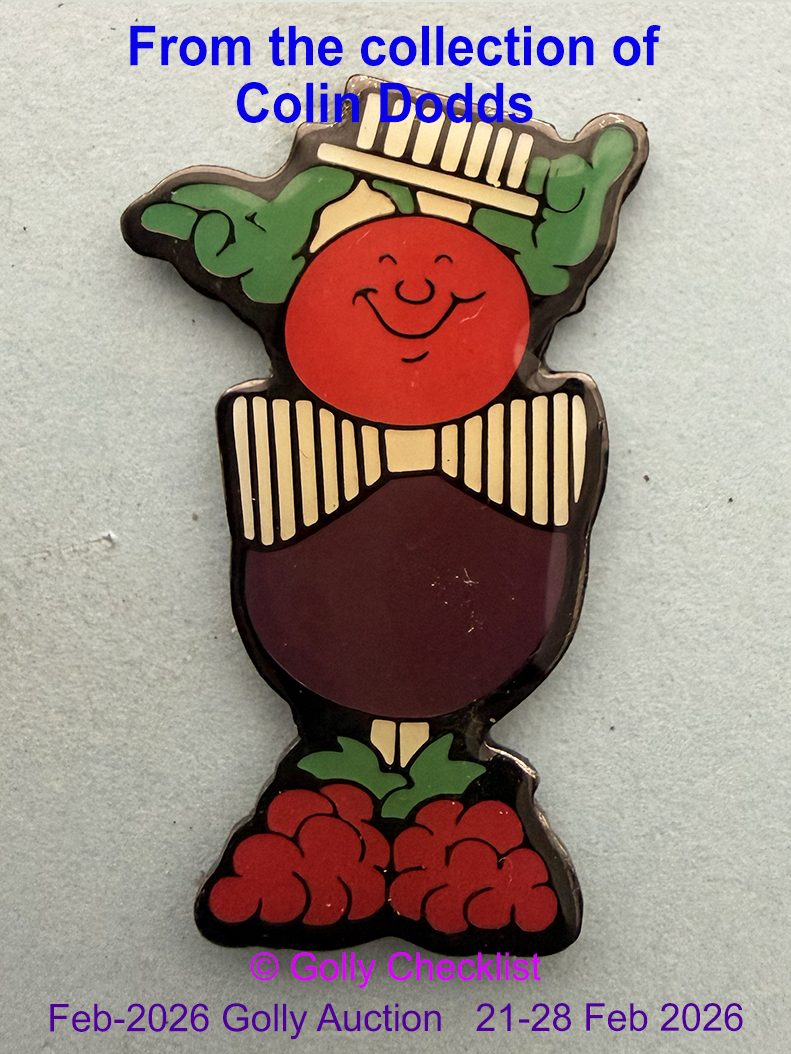 DESCRIPTION: We are delighted to offer a rarely seen badge for sale of the Golly Auction. The Mixed Fruit with Top Hat design from the unissued Fruits of 1995. These designs unusually have black backs with the Robertsons markings and are known in both 'acrylic coated' and 'uncoated' variations. This badge is the Coated Mixed Fruit design with Top Hat.. Examples rarely come onto the open market and few collectors have ever seen these items. Do not miss this opportuity to add this rarity to your collection.