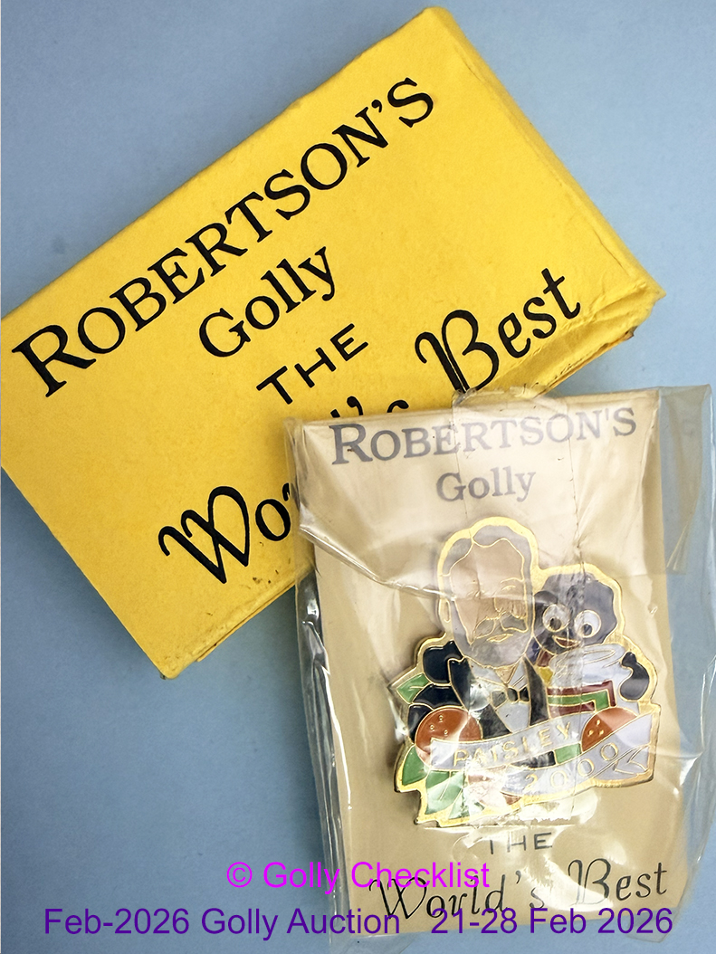DESCRIPTION: Limited edition badge issued in July 2000 issued as a souvenir for the exhibition of Robertson's badges and memorabilia at the Museum of Paisley, Scotland. Issued with full permission and approval of Robertson's. Strictly limited to an edition size of 1000 mounted on a card inside a card box similar to the original Golly brooches of the prewar era.
