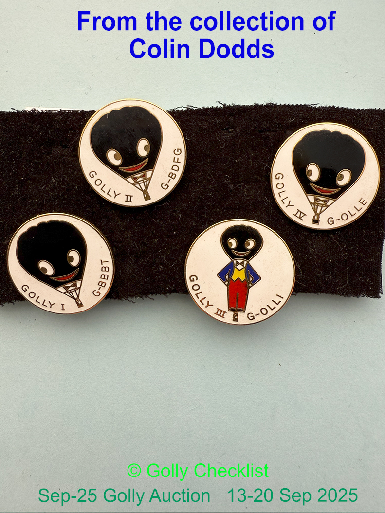 DESCRIPTION: The A set of four circular balloon badges showing Golly Balloons I, II, III & IV. This is the version with a white background. A version with a light blue background was produced at the same time. The blue background is more scarce and listed as Lot 46.
