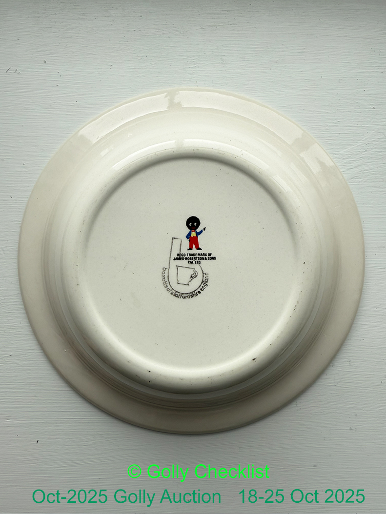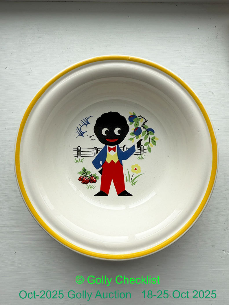 DESCRIPTION: A genuine Robertson's bowl showing a one-arm raised Golly with a ranch scene. Made by Barrett's of Staffordshire in 1980. Barrett's issued two versions of this item, this is the earlier version. Listed as D23 in the Golly Guide. This version has a yellow rim. See the links below for further details on this item.
