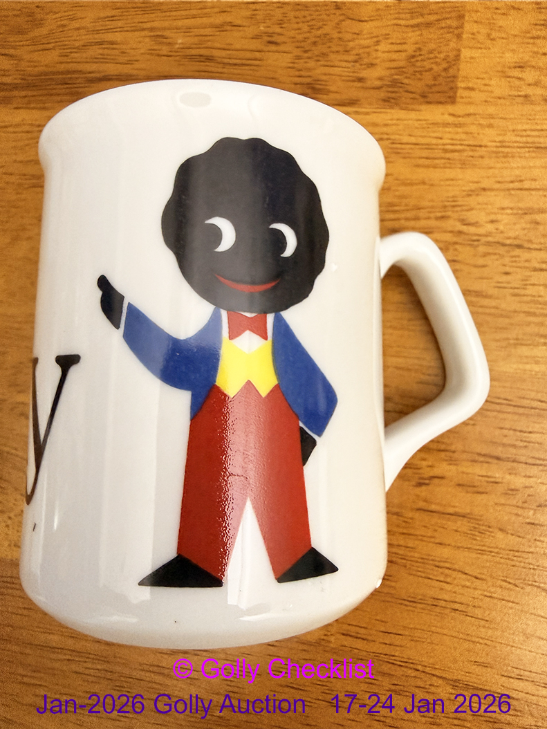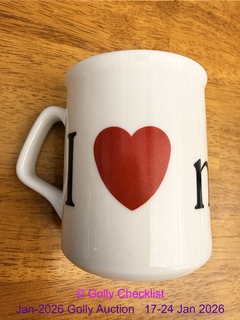 DESCRIPTION: A genuine limited edition Robertson's mug with the text 'I <heart> my <Golly>' showing one arm raised golly on the white mug. Limited editoin of 1200 issued in 2002. Listed as D50 in the Golly Guide. See the links below for further details on this item.