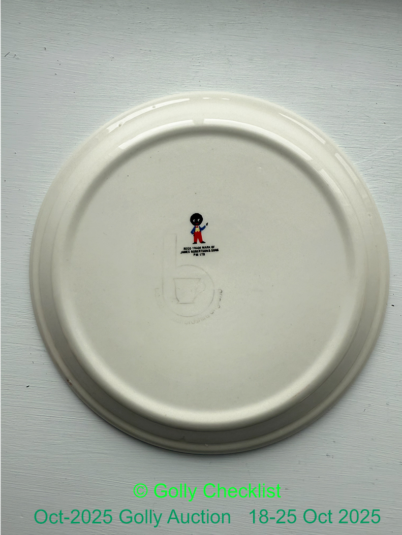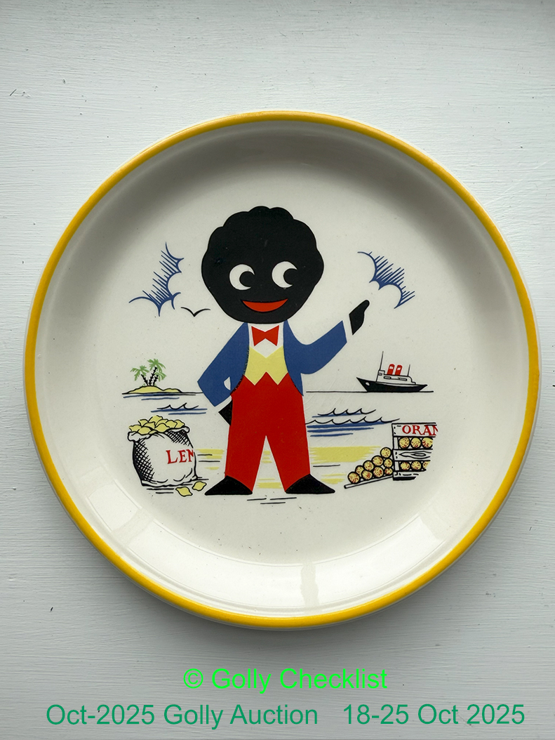 DESCRIPTION: A genuine Robertson's plate showing a one-arm raised Golly with a sea scene. Made by Barrett's of Staffordshire in 1980. Listed as D20 in the Golly Guide. This version has a yellow rim and the full colour golly backstamp to reverse. See the links below for further details on this item.