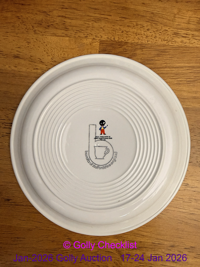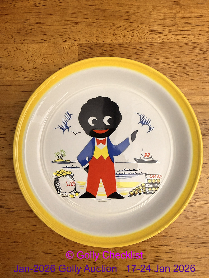 DESCRIPTION: A genuine Robertson's plate showing a one-arm raised Golly with a sea scene. Made by Barrett's of Staffordshire in 1980. Listed as D20 in the Golly Guide. This version has a yellow rim and the full colour golly backstamp to reverse. See the links below for further details on this item.