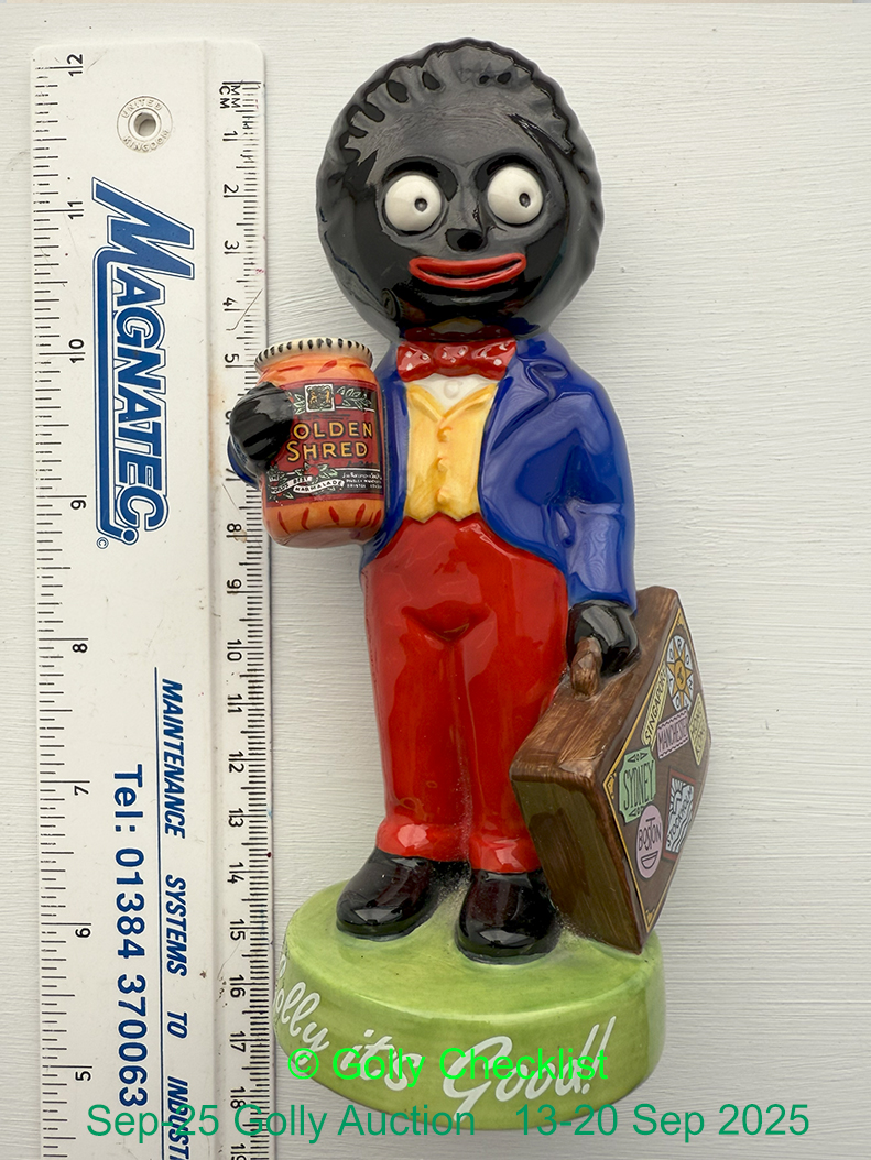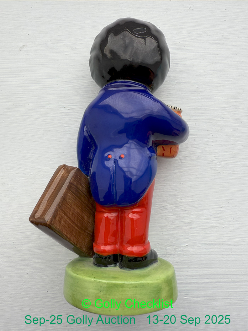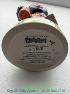 DESCRIPTION: The farewell golly figure made by Coalport in 2002. Beautiful item, in similar form to the large Shop display gollies [B19] which adorned grocers counters in the 1950/60's. This was the last figurine to have official approval from Robertsons. Listed as I.27 in the Golly Guide. See the links below for further details on this item. Produced in a limited edition of 2000 figures, this is number 1313.
