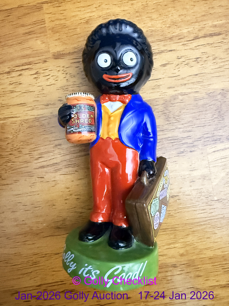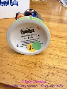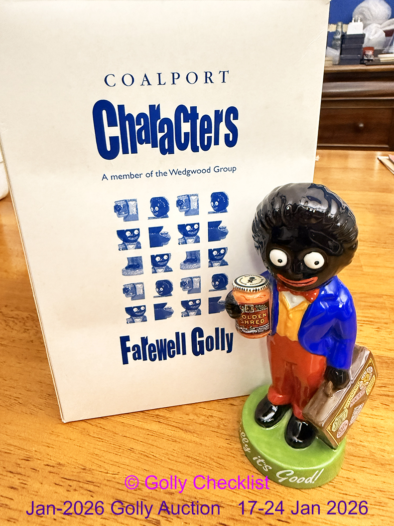 DESCRIPTION: The farewell golly figure made by Coalport in 2002. Beautiful item, in similar form to the large Shop display gollies [B19] which adorned grocers counters in the 1950/60's. This was the last figurine to have official approval from Robertsons. Listed as I.27 in the Golly Guide. See the links below for further details on this item. Produced in a limited edition of 2000 figures, this is number 1313.