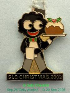 DESCRIPTION: This badge wasissued at Christmas 2003. Showing a waiter dressed as Father Chrtistmas the bar at feet reads "SLC CHRISTMAS 2003"
