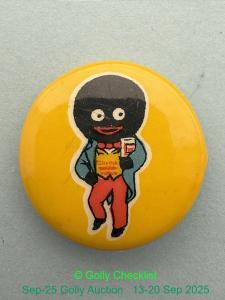DESCRIPTION: A genuine Robertson's Tin Button Golly badge with a Standard walking Golly with yellow background. 25mm in diameter. This is the early version with smooth hair. No makers name ...