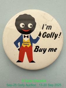 DESCRIPTION: A genuine Robertson's Tin Button Golly badge with a Standard 'One Arm Raised' Golly with Golden Shred waistcoat and 'I'm Golly Buy me' text. 64mm in diameter. This...