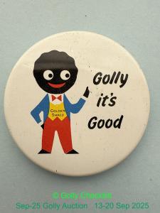 DESCRIPTION: A genuine Robertson's Tin Button Golly badge with a Standard 'One Arm Raised' Golly with Golden Shred waistcoat and 'Golly it's Good' text. 54mm in diameter. This ...