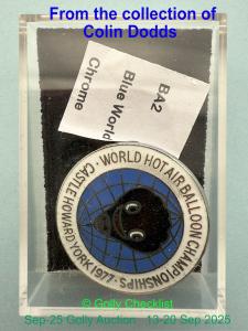 DESCRIPTION: A Golly Balloon Badge showing a Balloon on a chromed blue world with white titled border which reads: "World Hot Air Balloon Championships, Castle Howard, York 1977"