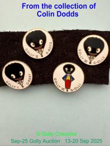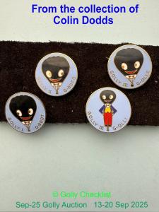 DESCRIPTION: The set of four circular balloon badges showing Golly Balloons I, II, III & IV. This is the version with a blue background. A version with a white background was produced at the ...