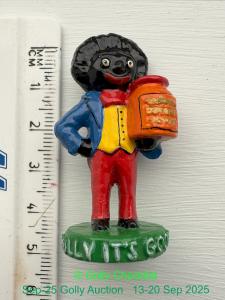 DESCRIPTION: The small golly with jar figure on green base is an official Robertsons figure that is rarely found. Standing around 50mm tall with Golly Its Good to base it makes a great display item.