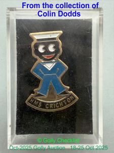DESCRIPTION: A rare opportunity to add one of most desirable badges from the 1980's to your collection. The genuine HMS CRICHTON. Issued to commemorate the Robertsons Golly becoming the official ...