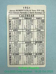 DESCRIPTION: Credit card sized pocket calendar dated 1951.