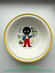 DESCRIPTION: A genuine Robertson's bowl showing a one-arm raised Golly with a ranch scene. Made by Barrett's of Staffordshire in 1980. Barrett's issued two versions of this item, this is ...