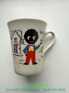 DESCRIPTION: A genuine Robertson's Golly Mug made in 1980. Showing 'One Arm raised' golly in front of house with lorry on other side. Great colour golly backstamp to bottom too.