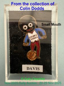 DESCRIPTION: Prewar Strawberry fruit design with small Golly head. Manufactured by H.W.Miller of Birmingham. Issued by Robertsons from 1932. Certified as genuine by the Miller backstamp to ...