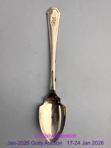 DESCRIPTION: Metal spoon 20cm long with enamelled Golly around 3cm long at top. Very raely seen. Golly shown in prewar colours with yellow vest although no Golden Shred to chest.