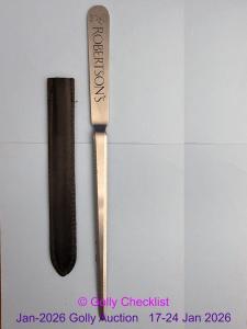 DESCRIPTION: Letter opener with black outlined 'One arm raised' Golly to handle along with 'ROBERTSON'S'. Stainless steel. 246mm long. With original black holder.