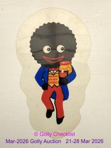 DESCRIPTION: An transfer showing a lovely image of an early Golly with shading to pupils, face and hair holding a jar of Golden Shred with thumb up in the air. Attached to a piece of wood. If you...