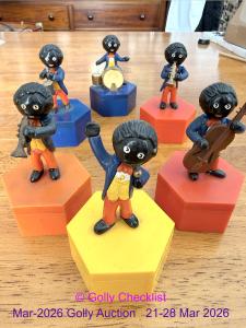 DESCRIPTION: A set of Golly figure by Dodo. Showing different band members on the lids of coloured hexagonal box bases. Made in Hong Kong in the 1980's by Dodo Designs. These are genuine ...