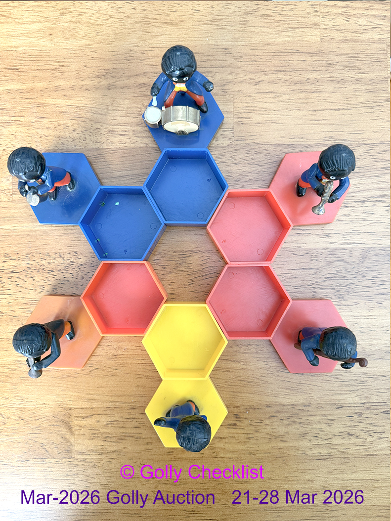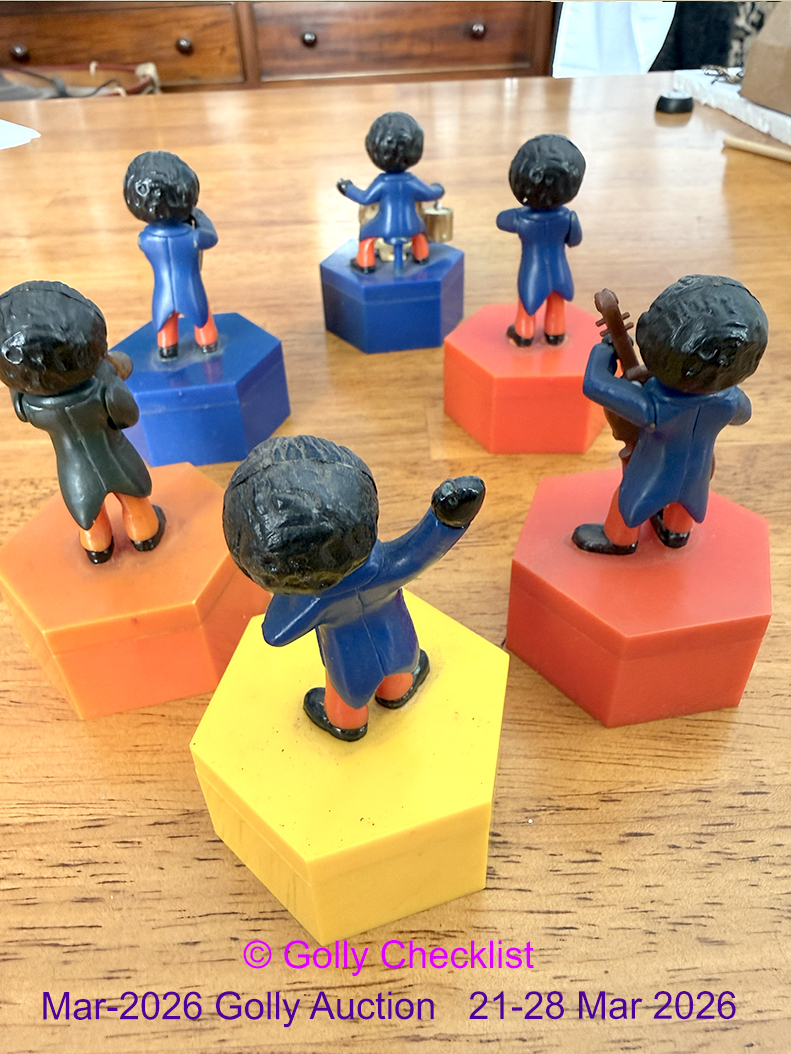 DESCRIPTION: A set of Golly figure by Dodo. Showing different band members on the lids of coloured hexagonal box bases. Made in Hong Kong in the 1980's by Dodo Designs. These are genuine Robertsons items which are difficult to find. The six for sale include two trumpeters and no guitarist.
