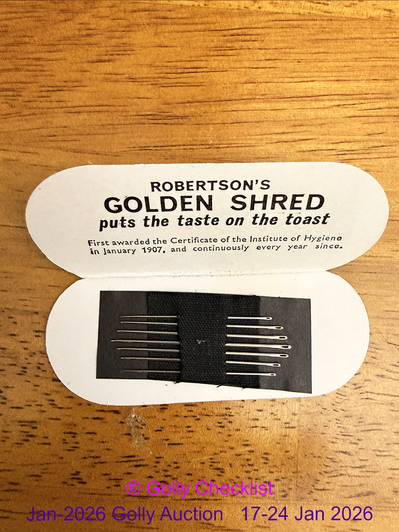 DESCRIPTION: A genuine Robertson's Needle case from the 1970/80's. Shows a Standard Golly with one arm raised which opens up to give needles.