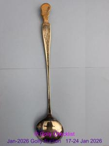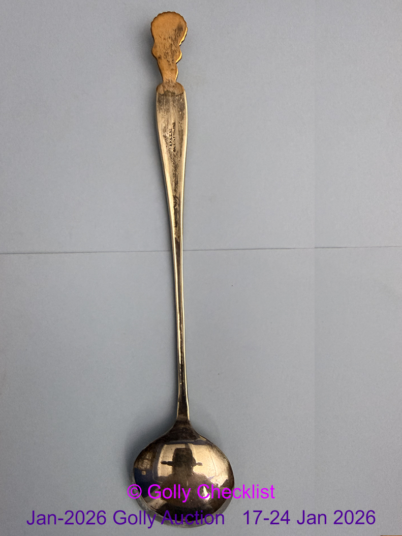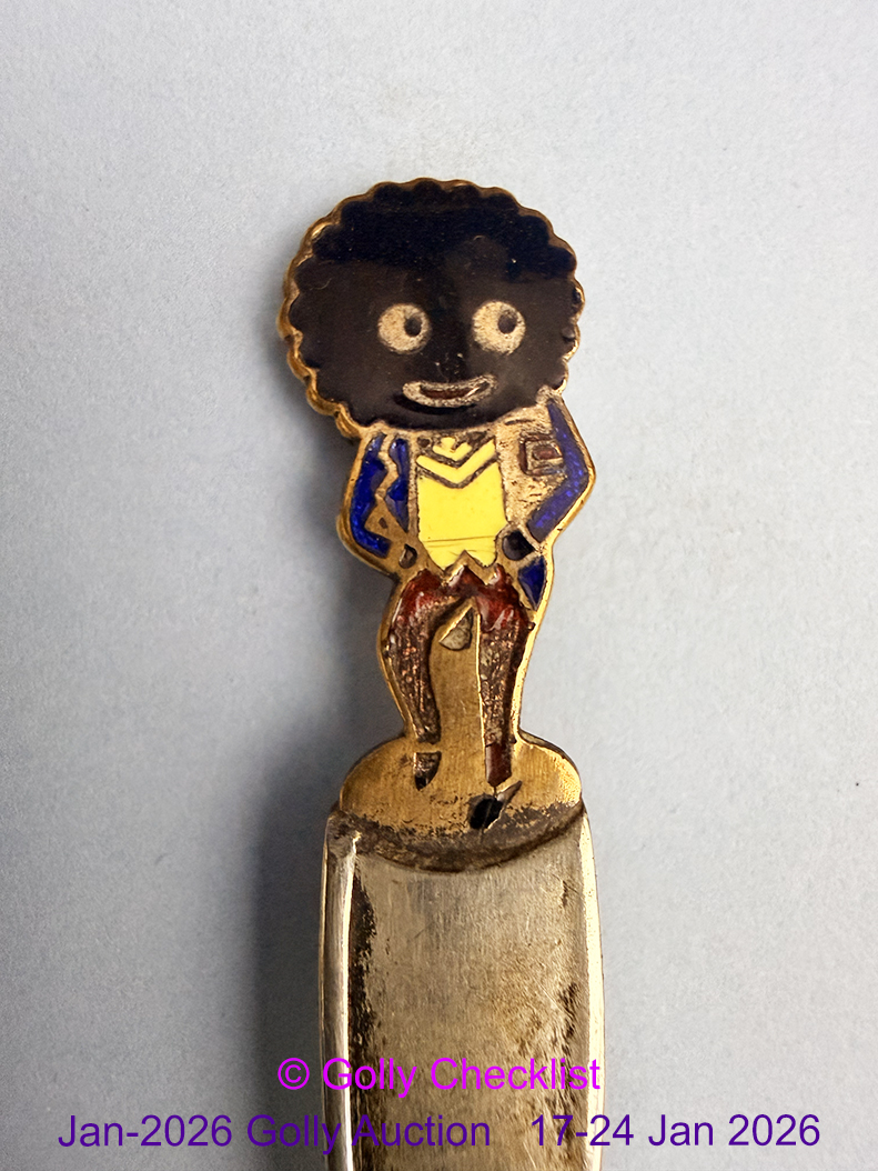 DESCRIPTION: Metal spoon 20cm long with enamelled Golly around 3cm long at top. Very raely seen. Golly shown in prewar colours with yellow vest although no Golden Shred to chest.