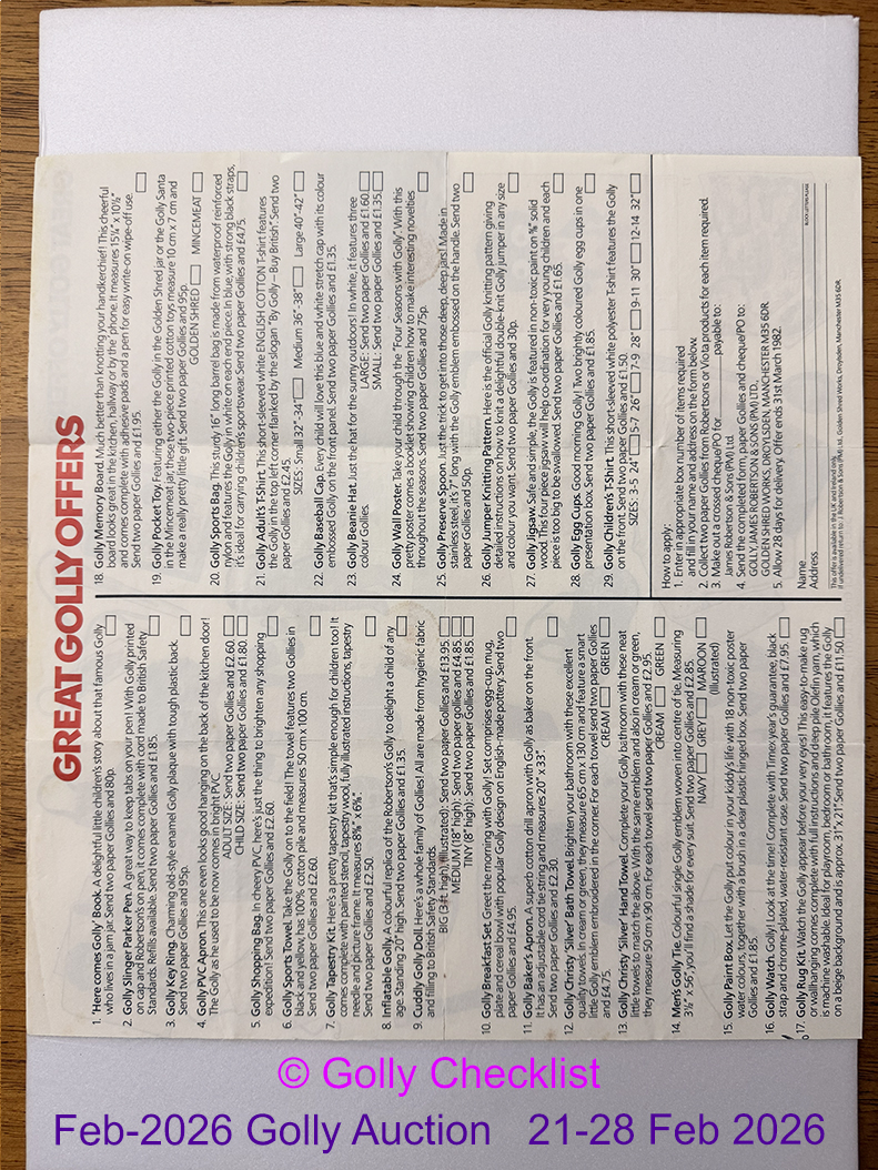 DESCRIPTION: A Great Golly Offer leaflet first issued in 31-Mar-1981. Showing a range of interesting ephemera items. Enabling you to date them quite accurately. No badges shown. In full colour.