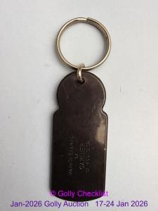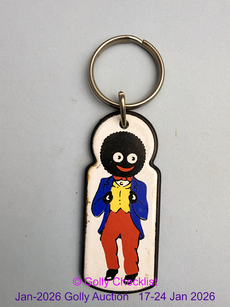 DESCRIPTION: A genuine Robertson's Keyring made by Garnier. In the form of a metal insert and black plastic back in shape of a keyhole. Standard walking Golly on a white background. Made in the early 1980's.