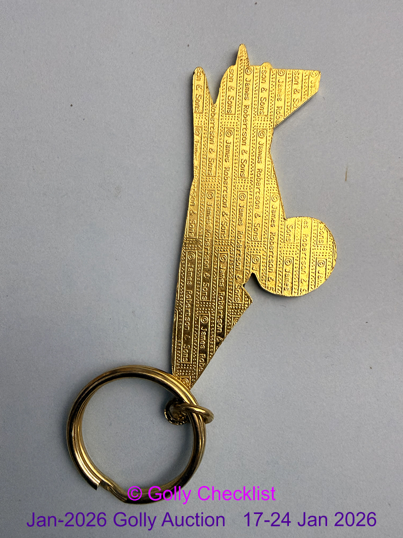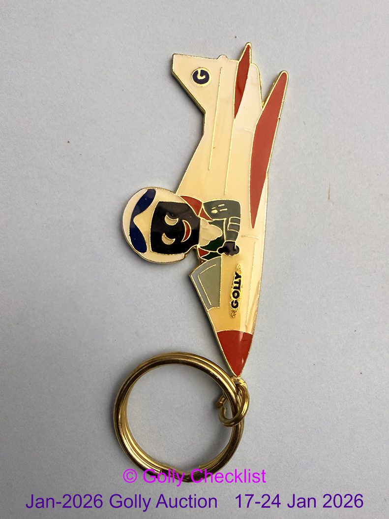 DESCRIPTION: A genuine Robertson's Keyring issued in 1990 showing a Jet Pilot. This is known in two versions... although this information has not made its way into the Golly Checklist yet ... the main difference is in the size of the 'G' on the tail. Large and Small versions exist. This is the SMALL 'G' version. With Robertsons backstamp on reverse.