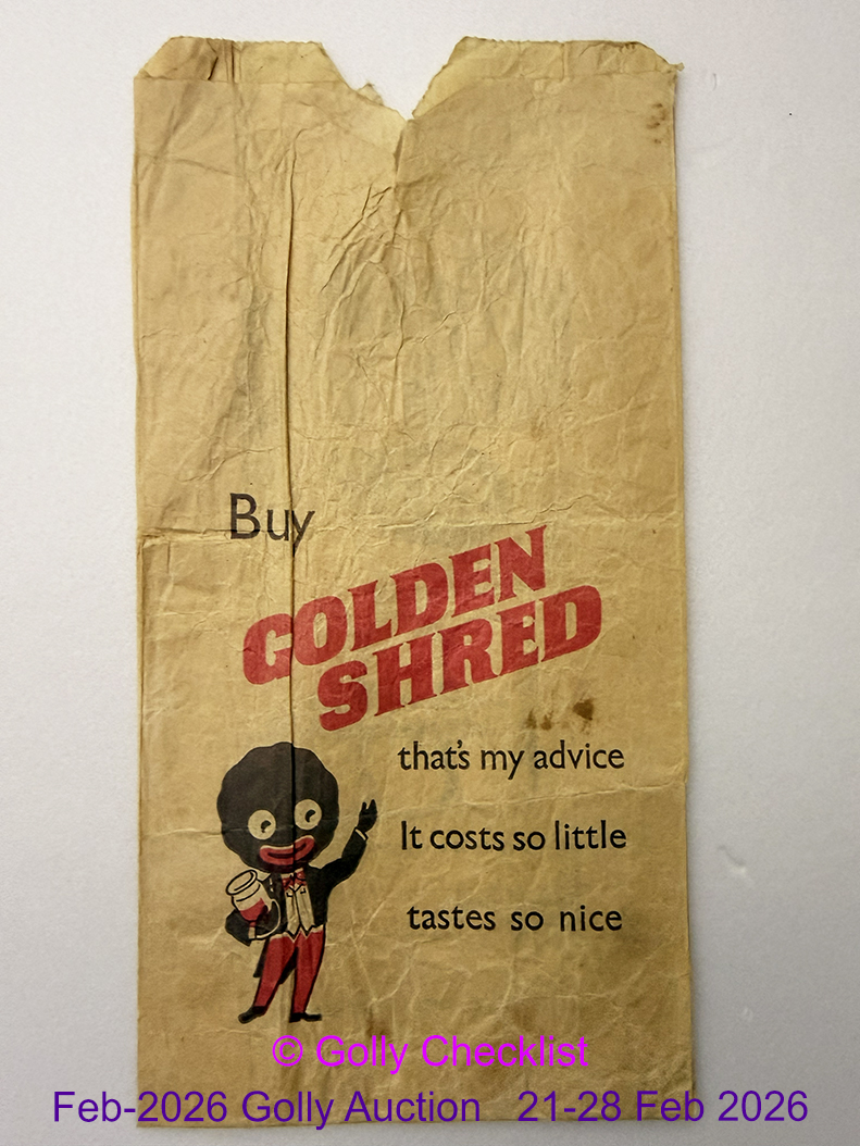 DESCRIPTION: Paper bag in fair condition. Design shows 'Buy Golden Shred that's my advice. It costs so little tastes so nice'.
