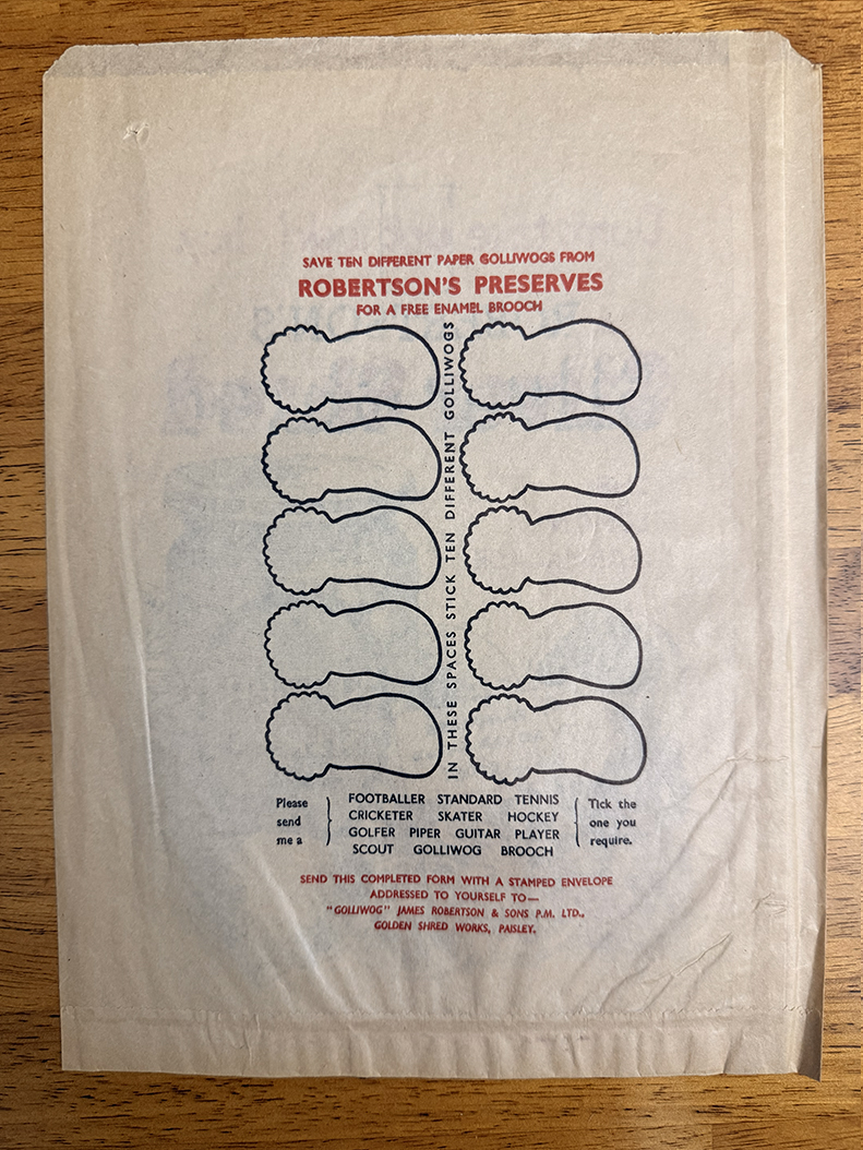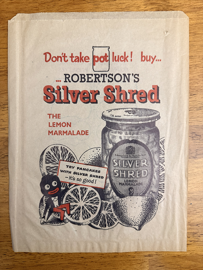 DESCRIPTION: Paper bag in exellent condition. Design shows 'Don't take pot luck but Robertson's Silver Shred' alongside some great artwork.