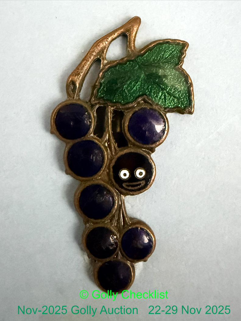 DESCRIPTION: Prewar Blackcurrant fruit design with small Golly head as one of the berries. Manufactured by Miller of Birmingham. Issued by Robertsons from 1932. Certified as genuine by the Miller backstamp to reverse. One of the most desirable of the prewar fruits.
