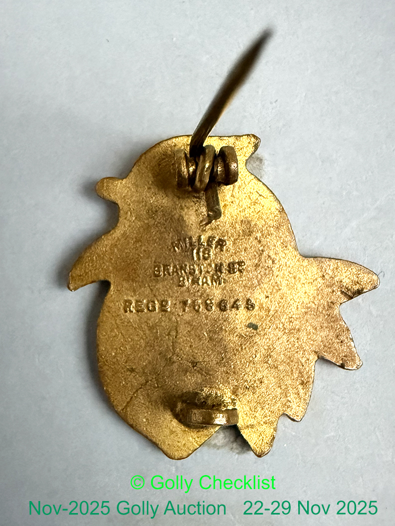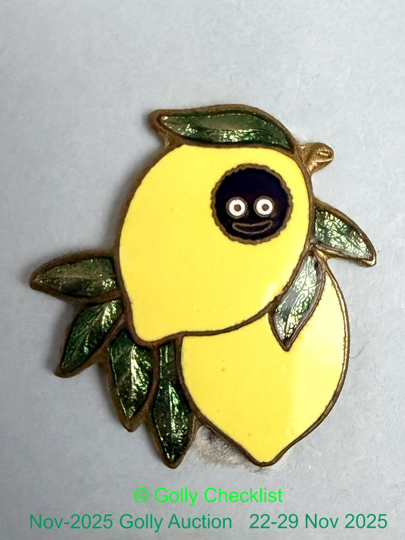 DESCRIPTION: Prewar Lemon fruit design with small Golly head. Manufactured by Miller of Birmingham. Issued by Robertsons from 1932. Certified as genuine by the Miller backstamp to reverse.