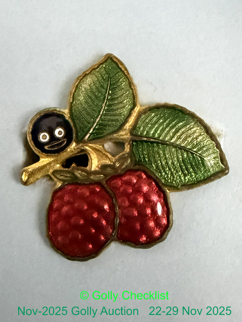 DESCRIPTION: Prewar Fruit Raspberry Golly badge in immaculate condition. Manufactured by Miller of Birmingham and issued by Robertsons sometime after 1932. Certified as genuine by the Miller backstamp to reverse. Note the 'REGD 768826' is on two lines. Note for the specialist collector: Two versions of this backstamp are known, this one being the 'large' version.
