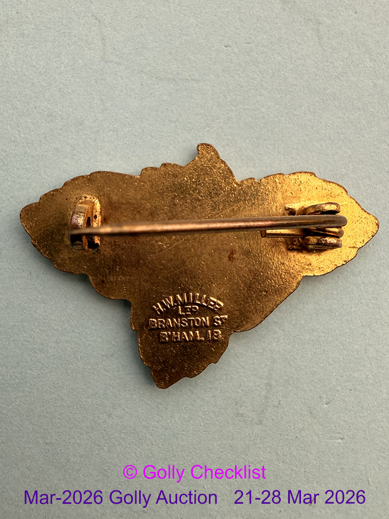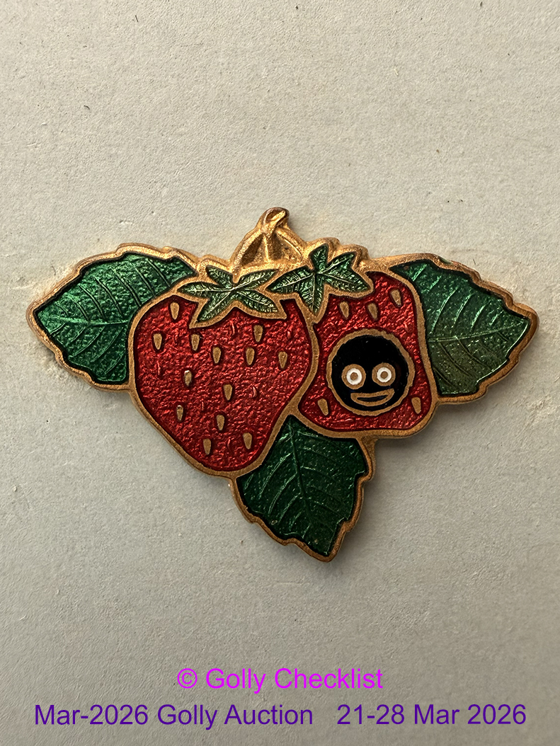 DESCRIPTION: Prewar Strawberry fruit design with small Golly head. Manufactured by H.W.Miller of Birmingham. Issued by Robertsons from 1932. Certified as genuine by the Miller backstamp to reverse.