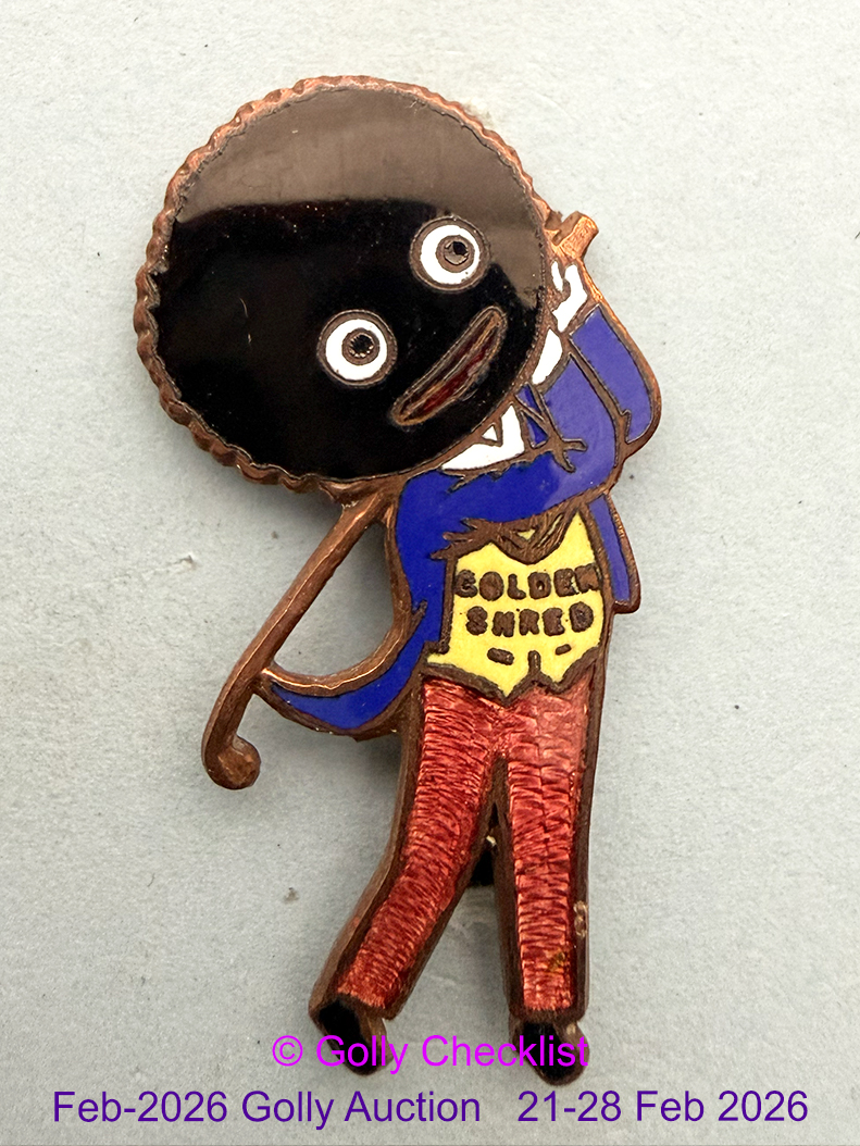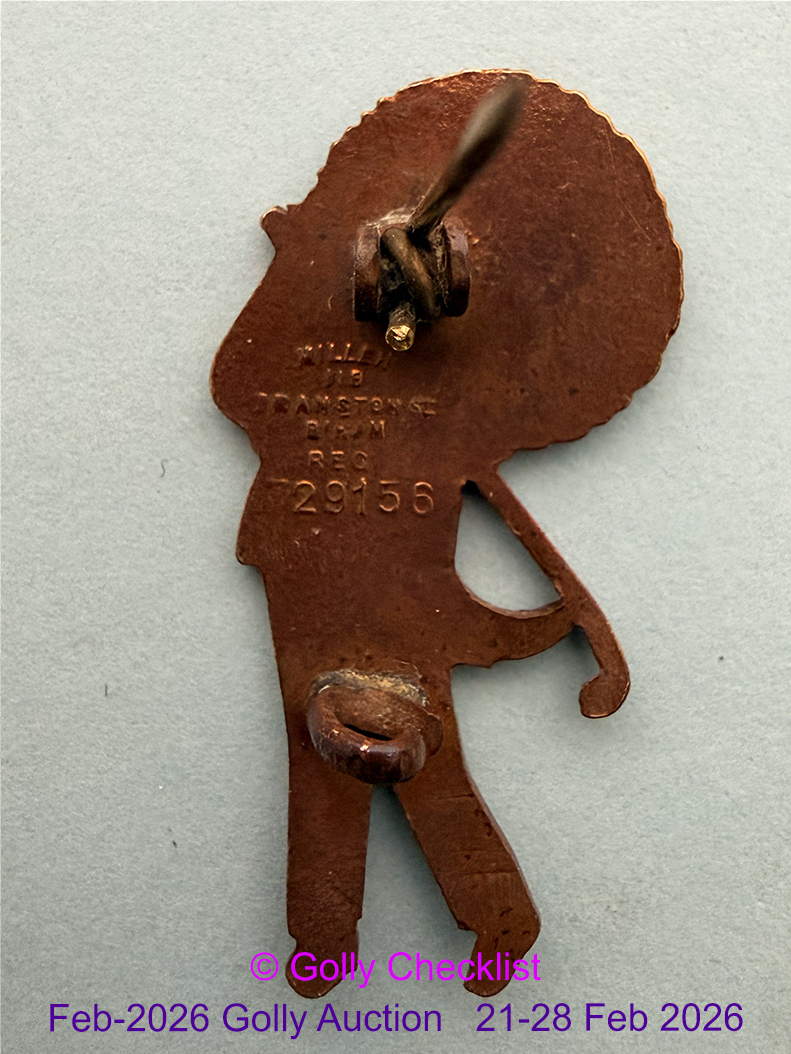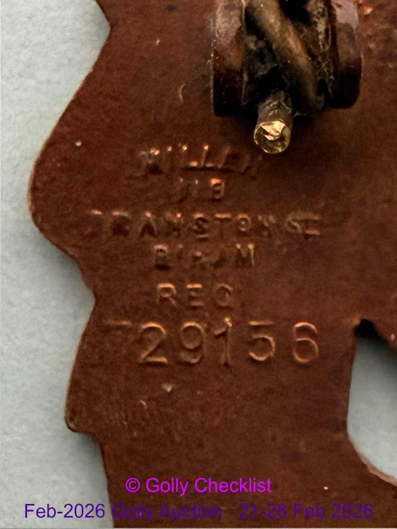 CONDITION: Presented for sale in excellent condition. Very faint stress lines visible to golly's left leg (right as viewed). Protective varnish coating still intact. Complete with original straight pin. For further information on grading please