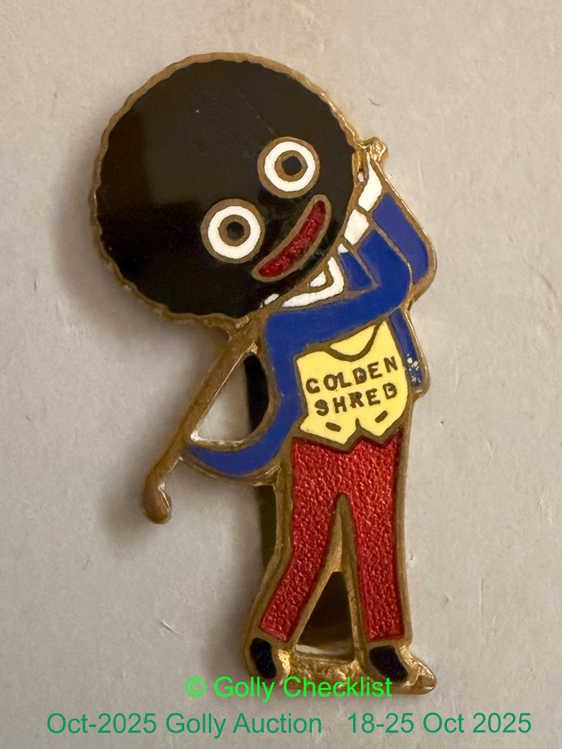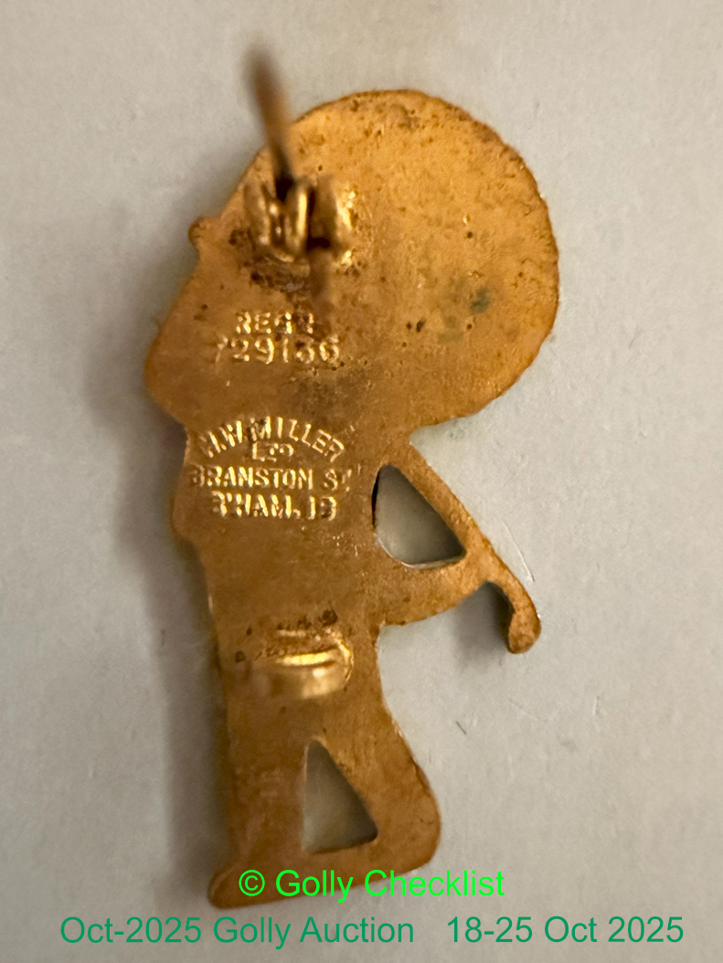 DESCRIPTION: Prewar Golly Golfer with bar between the feet for sale in immaculate condition. This delightful badge design was one of the first enamel Golly badges ever issued by Robertsons. Manufactured by the high quality badge maker H.W.Miller of Birmingham and issued by Robertsons in the early 1930's. Certified as genuine by the Miller backstamp to reverse.