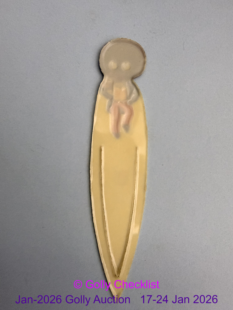 DESCRIPTION: A chance to a very attractive, early Golly bookmark to your collection. In white plastic with lovely walking Golly, shaped like a token at the top, 'Robertson's Bramble Seedless’ in red on chest, 106 mm high.