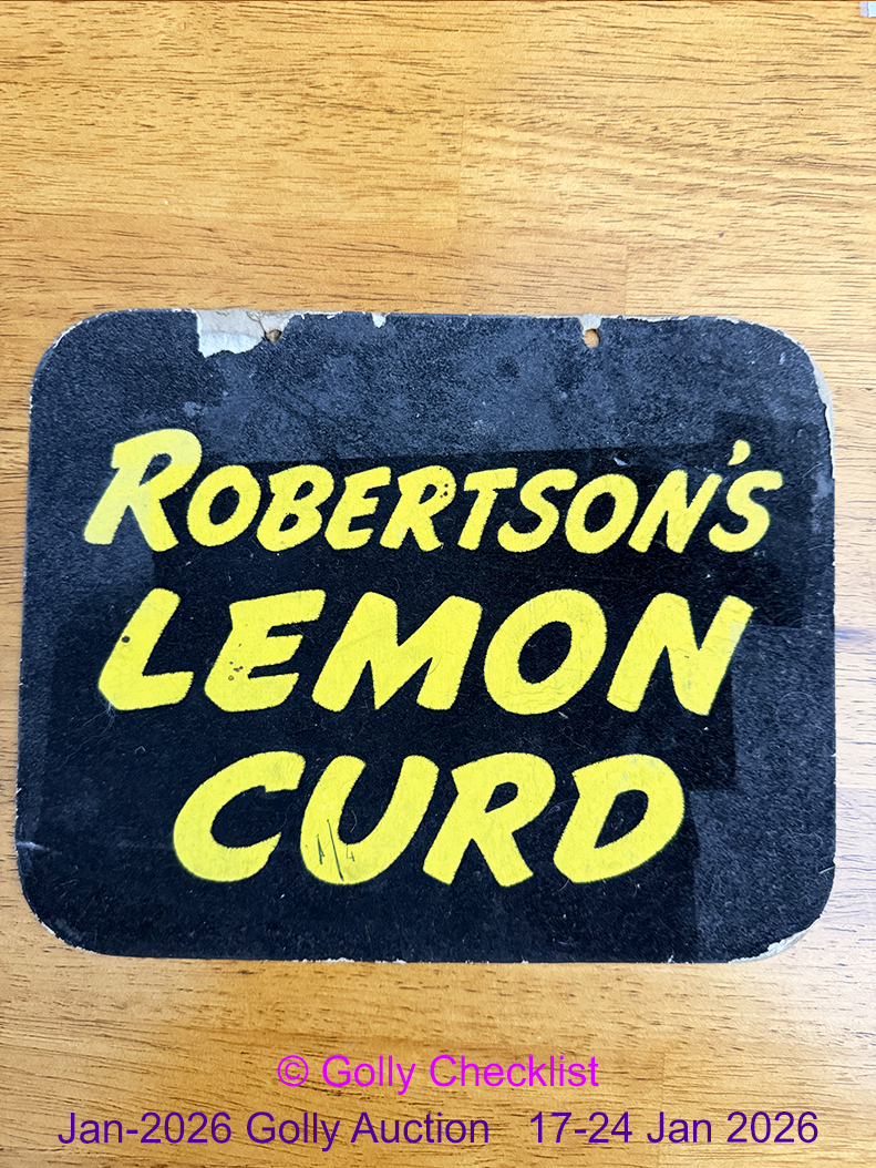 DESCRIPTION: Offered for sale is an original 'Robertsons Lemon Curd' shop display Showcard. Printed on a thick black felt card. With two holes where a string would have been attached (no longer present). This is a genuine item, currently unlisted in the Golly Guide although similar to Aad213 Dated to approx 1960.