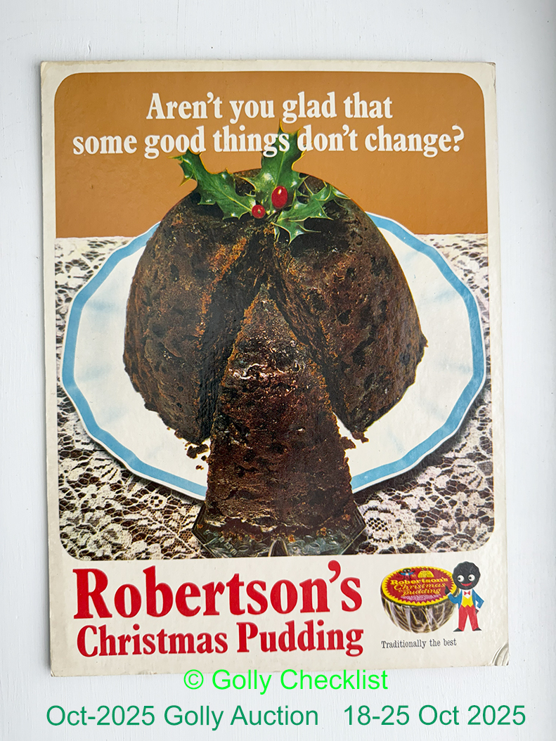 DESCRIPTION: Offered for sale is an original shop display Showcard advertising Robertsons Christmas Pudding. Printed single sided on thick brown card with the slogan "Aren't you glad some good things don't change?" showing one slice cut. From around 1960's. This is a genuine original item listed as Aad59 in the Golly Guide.