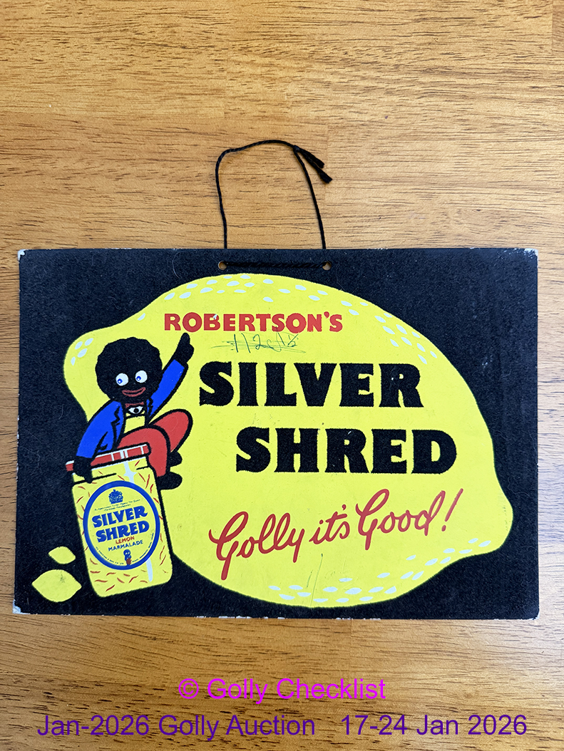 DESCRIPTION: Offered for sale is an original Robertsons Silver Shred shop display Showcard. Printed on a thick card with a string attached to hang on the wall. This is a genuine item, listed in the Golly Guide as Aad87. Dated to approx 1960.