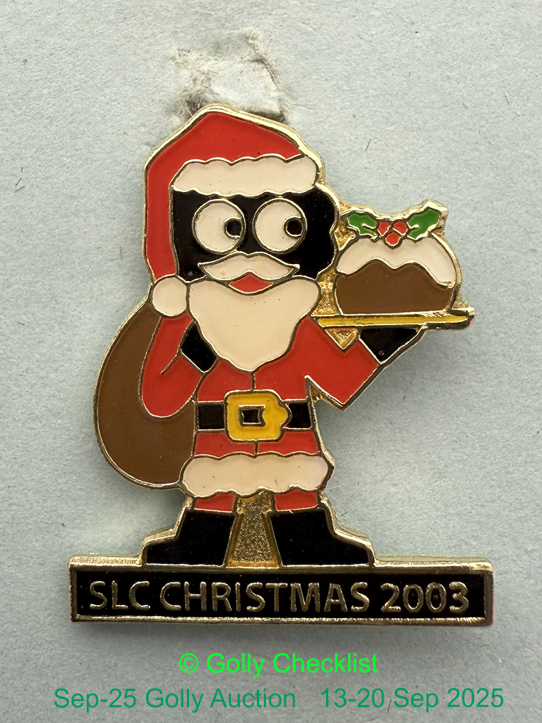 DESCRIPTION: This badge wasissued at Christmas 2003. Showing a waiter dressed as Father Chrtistmas the bar at feet reads "SLC CHRISTMAS 2003"
