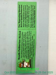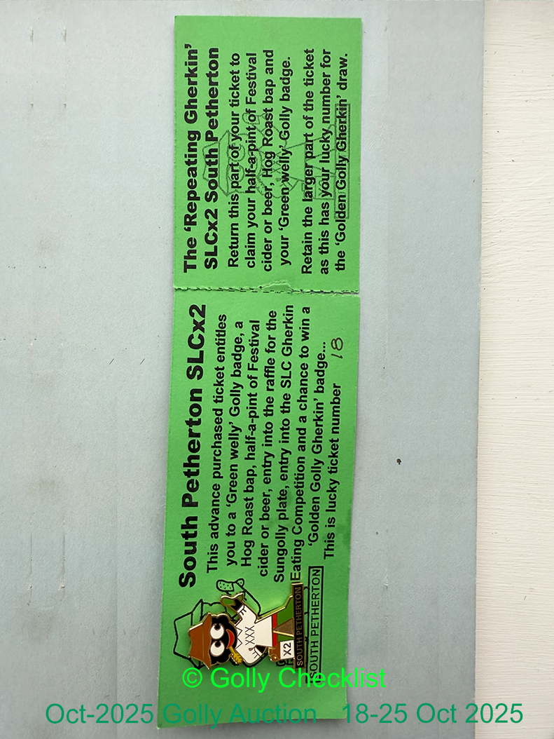 DESCRIPTION: This farmer themed badge was produced for the second 'extra-ordinary' SLC which took place on 29-Aug-2004 at the Brewers Arms, South Petherton, Somerset. Tickets were sold in advance entitling the holder to a ‘Green welly’ Golly badge, a Hog Roast bap, half-a pint of Festival cider or beer, entry into the raffle for the Sungolly plate, entry into the SLC Gherkin Eating Competition and a chance to win a ‘Golden Golly Farmer’ badge. This is a rare opportunity to find the badge attached to the original ticket with raffle ticket (no. 18 over reverse) still attached. Please note the ticket is in two pieces, detached along the intended perforation... someone had to forgoe their hog roast bap to keep their ticket intact!