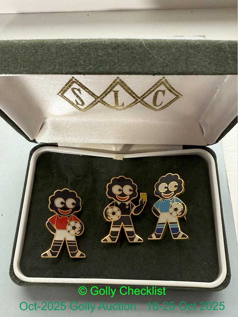 DESCRIPTION: This set of three badges in original presentation case was produced for the sixth SLC which took place close to Robertsons HQ at Droylsden Manchester on 6-Apr-2003. This set, in original green velour box, comprises the Football Golly in Manchester United and City strips along with the referee holding yellow card.