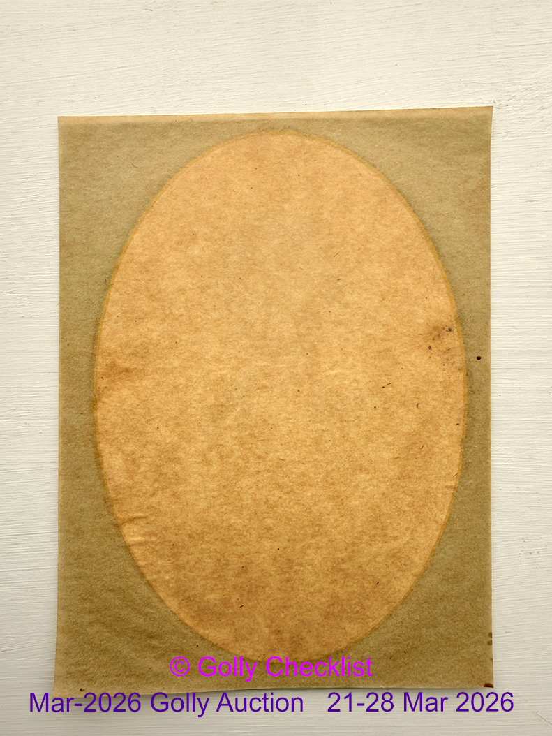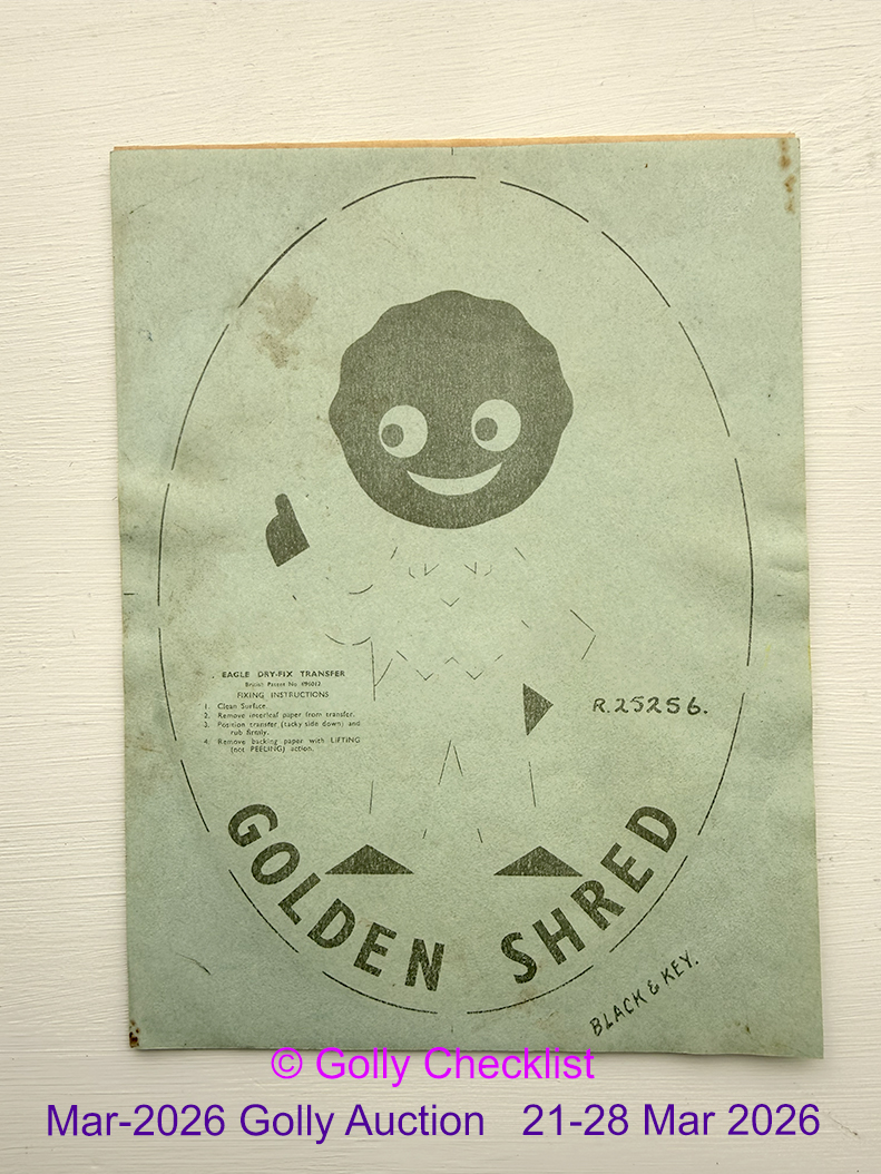 DESCRIPTION: An early dry fix transfer showing a one arm raised Golly. This item is in unused condition, with both original tranfer sides still intact. If you collect Golly items from the stickers section H, don't miss out on this or you may have to wait a while to find another.